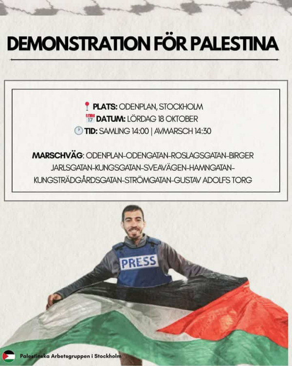 Lördag 18 oktober kl 14:00. Odenplan, Stockholm. Avmarsch 14:30 mot Gustav Adolfs torg.