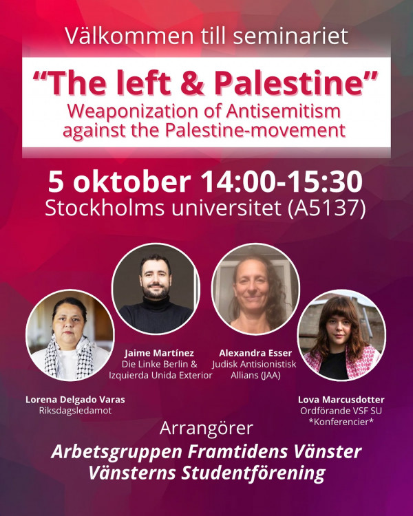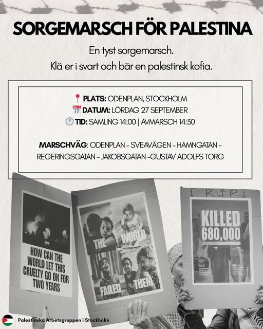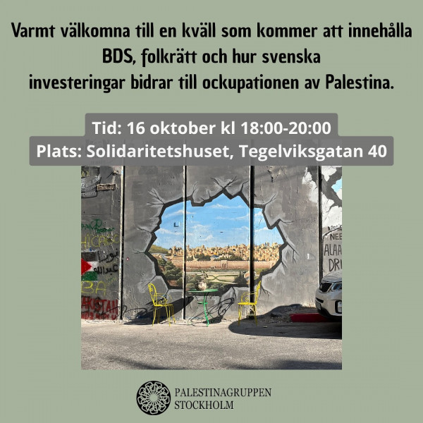 Efter det kommer Jakob König från Fair Finance Guide berätta om hur vi kan hindra svenska investeringar från att bidra till ockupationen och det pågående folkmordet i Gaza, och hur man som individ kan påverka genom sina val gällande pensionsfonder och bank.