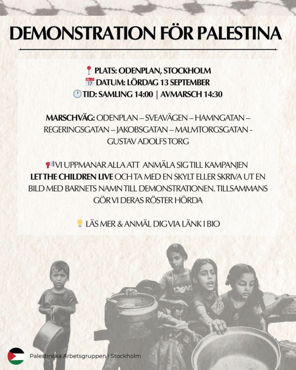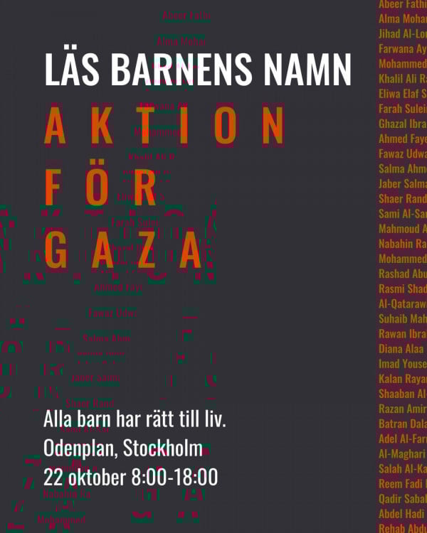 Förra året samlades vi för att läsa namnen på de barn som dödats i Palestina och Israel sedan 7 oktober 2023. Sedan dess har tusentals fler barn dödats i Gaza. Vi samlas i år igen för att läsa barnens namn och kräva att Sverige ska agera för att civila ska skyddas och att våldet stoppas nu - inte ett liv till!
